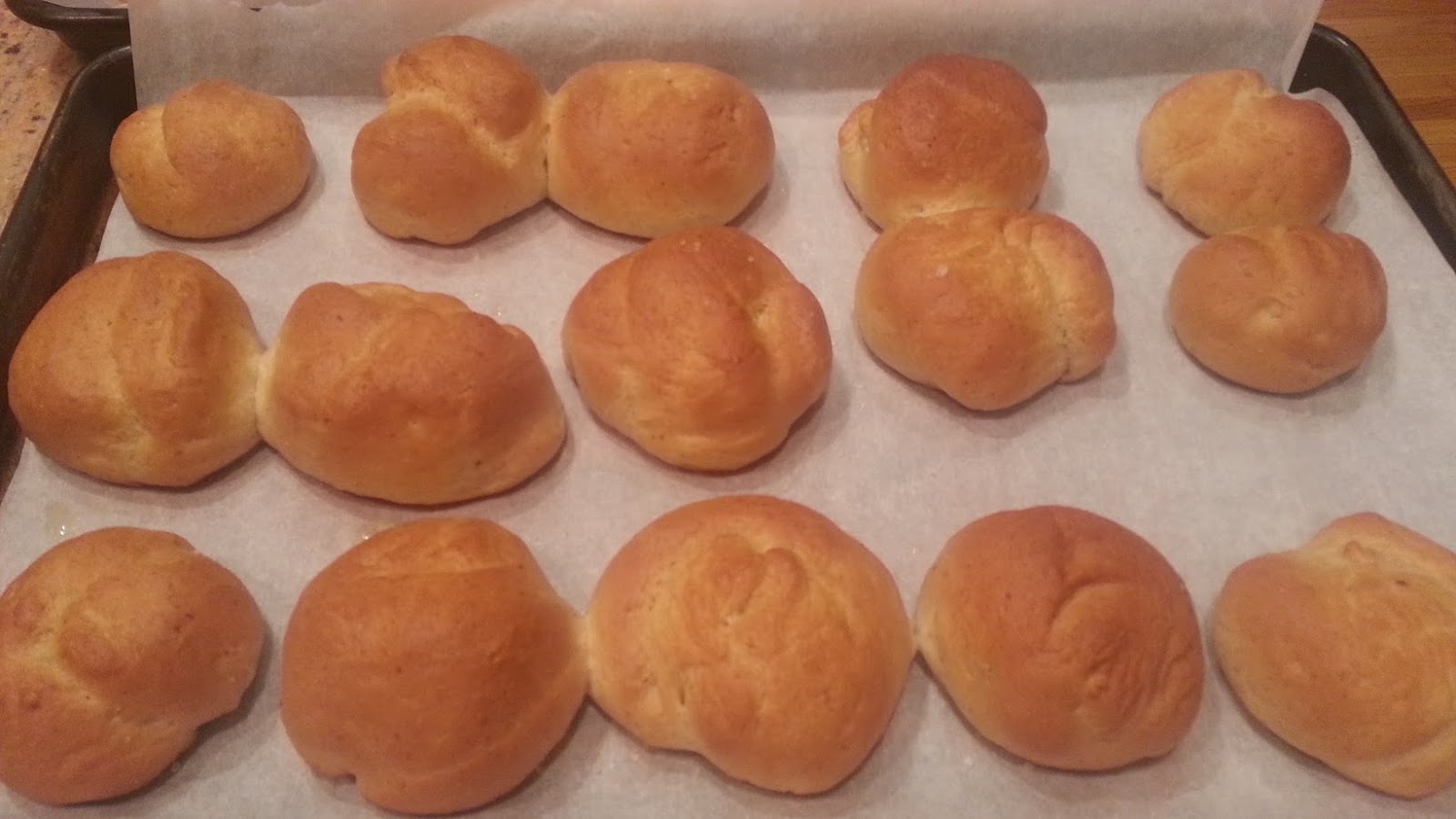 3. Punch dough down and divide in fourths. Divide each fourth into 12 strips. Roll each strip between your palms to make a ball. Place 2 inches apart on baking sheets lined with parchment paper.